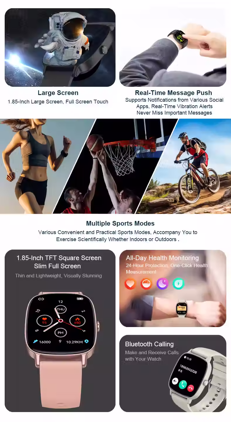 Elevate Your Daily Routine The P122 Smart Watch is more than just a timepiece—it’s a powerful personal assistant designed specifically for the modern woman. Featuring a stunning 1.85-inch HD touchscreen, this watch blends elegant design with high-performance technology. Whether you’re smashing a workout, managing a busy work schedule, or tracking your wellness journey, the P122 keeps you connected and informed without ever having to reach for your phone.